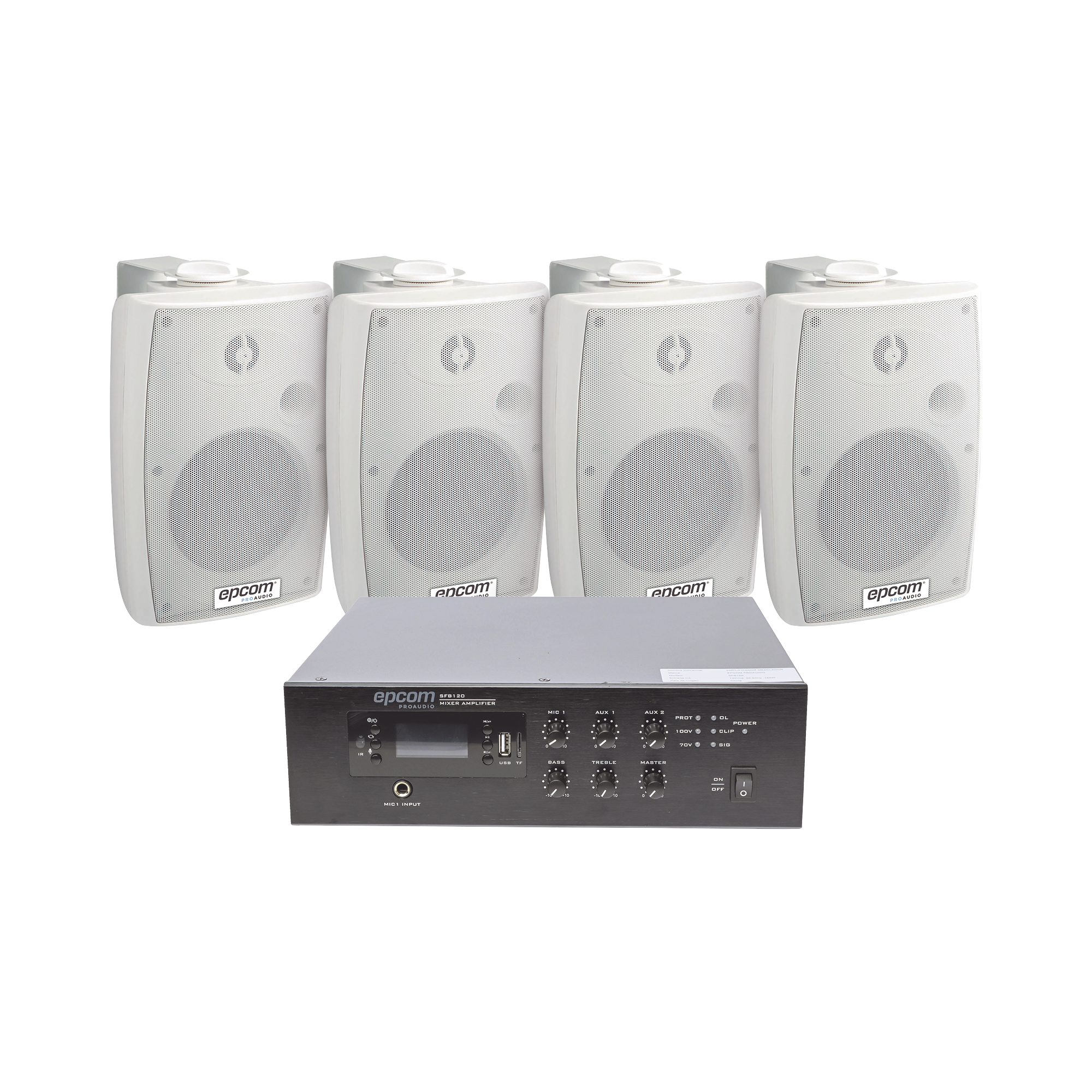 KIT de Amplificador de 120W para Escritorio | 4 Altavoces de Pared color Blanco 2.5W - 20W | Sistema 70/100V