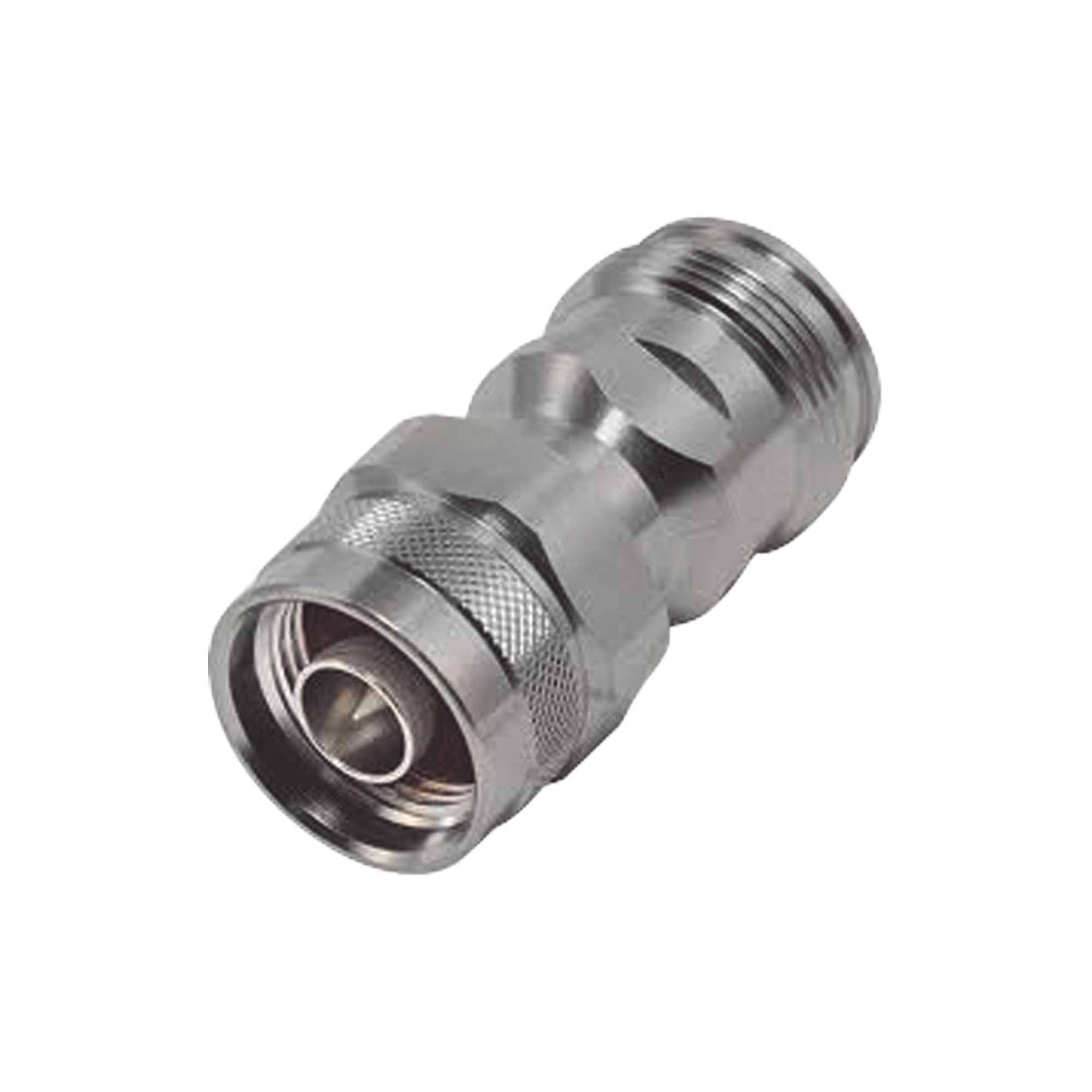 Adaptador en Línea de Conector 4.3-10 Hembra a N Macho, Bronce Blanco/ Plata/ Teflón.