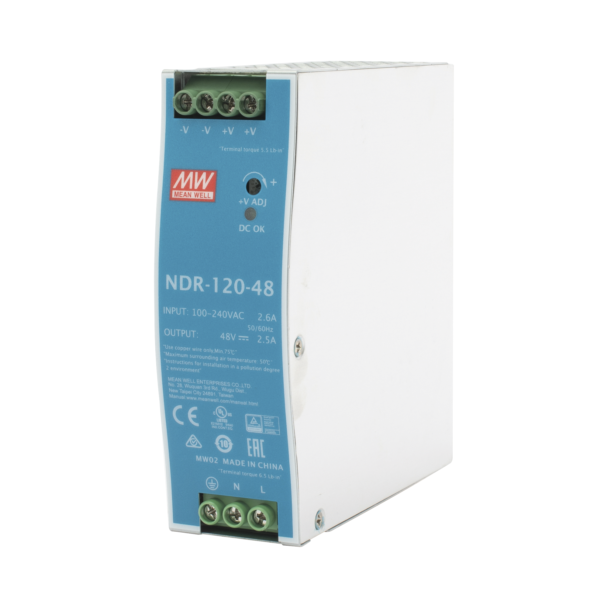 Fuente de poder industrial de 120 W, salida 48 Vcc, entrada 90~264 VCA, para montaje en riel DIN,