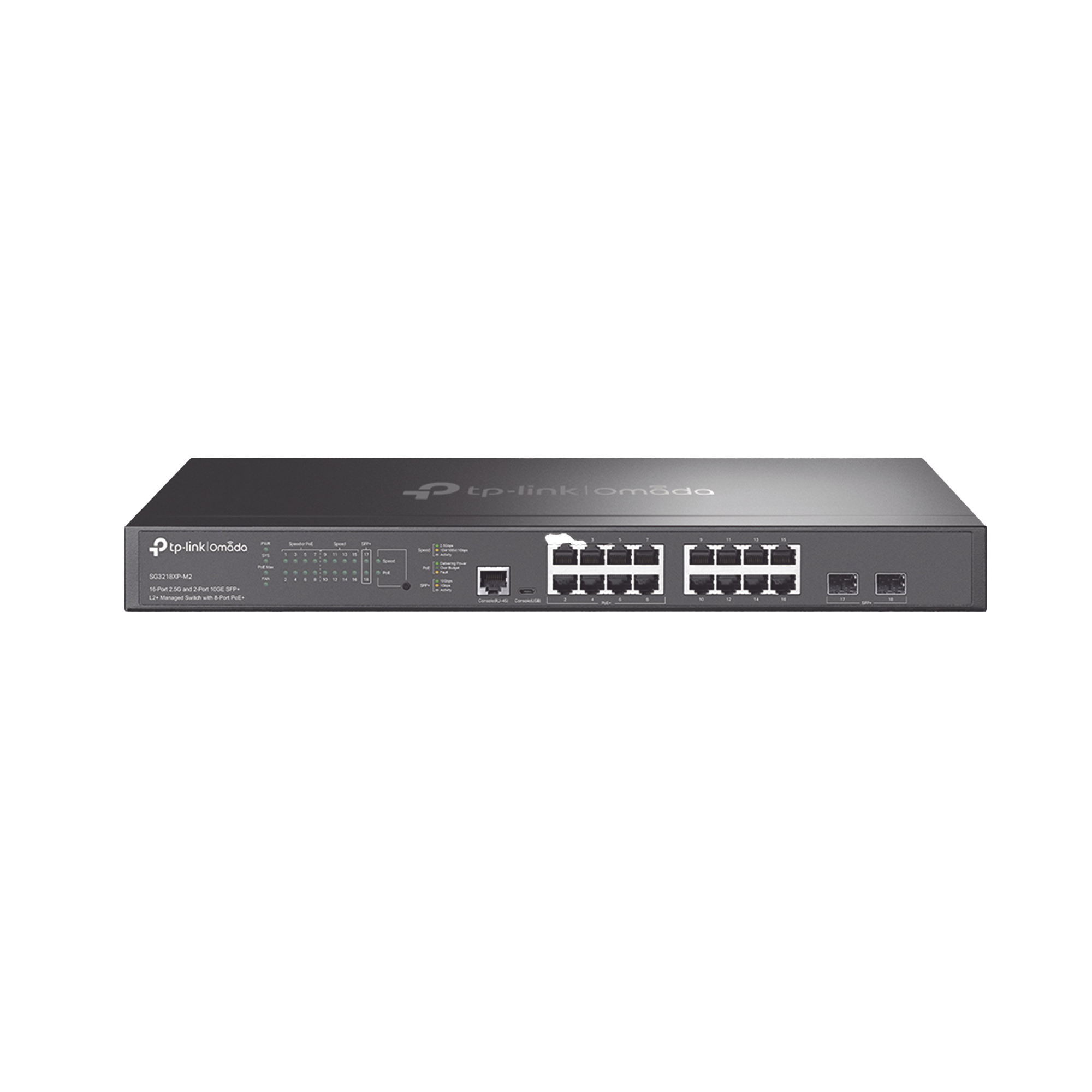 Switch L2+ Omada PoE+ / 8 Puertos PoE+ MultiGigabit 2.5G / 2 Puertos SFP+ 10G / 2 Puertos Consola (RJ45 y microUSB) / Administración Centralizada Omada o Stand-Alone / Multicast IGMP / Presupuesto PoE 240W / Montaje en Rack / (SG3210XHPM2)