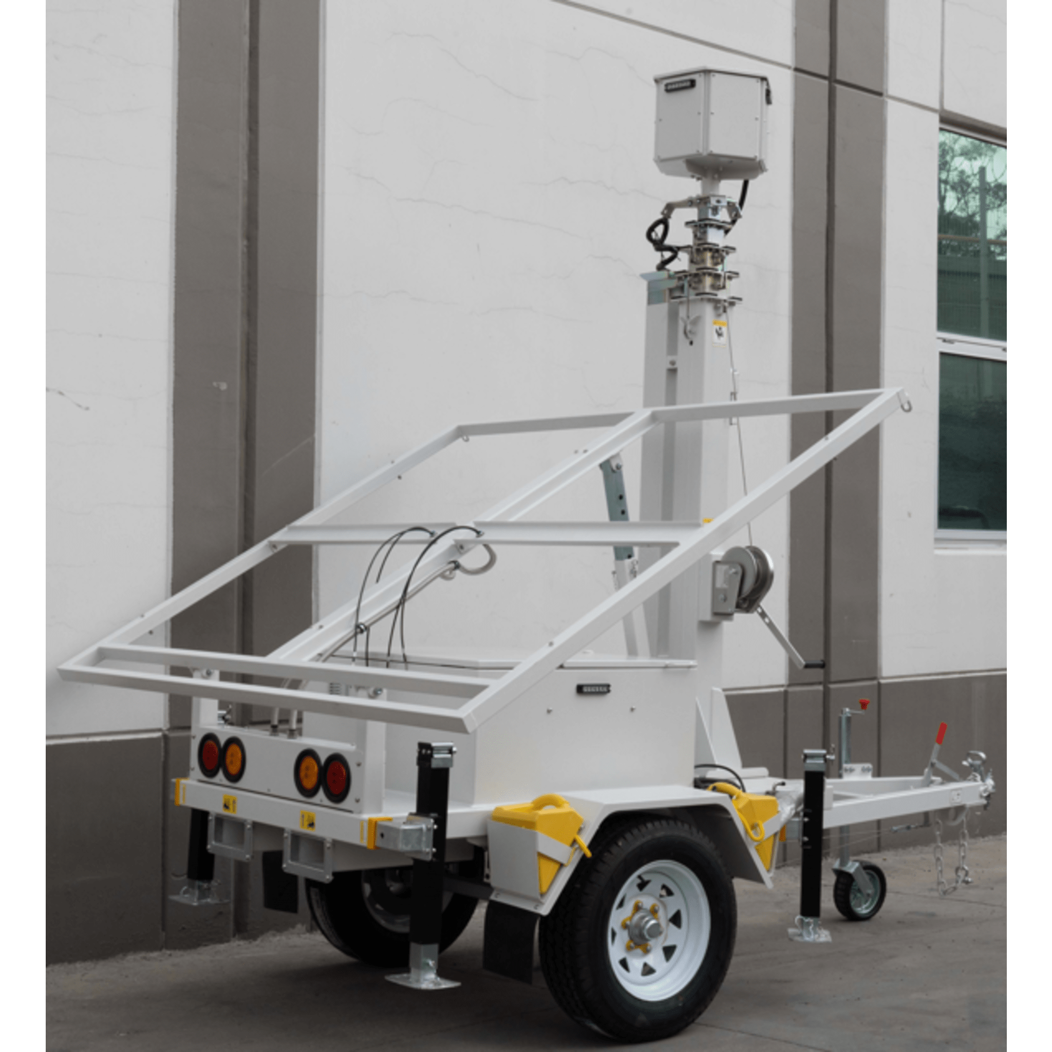 Traila / Remolque con Mástil Retráctil de 7.5 m. para Videovigilancia o Iluminación, con capacidad para Instalar Módulos Solares y Baterías (No incluidos)