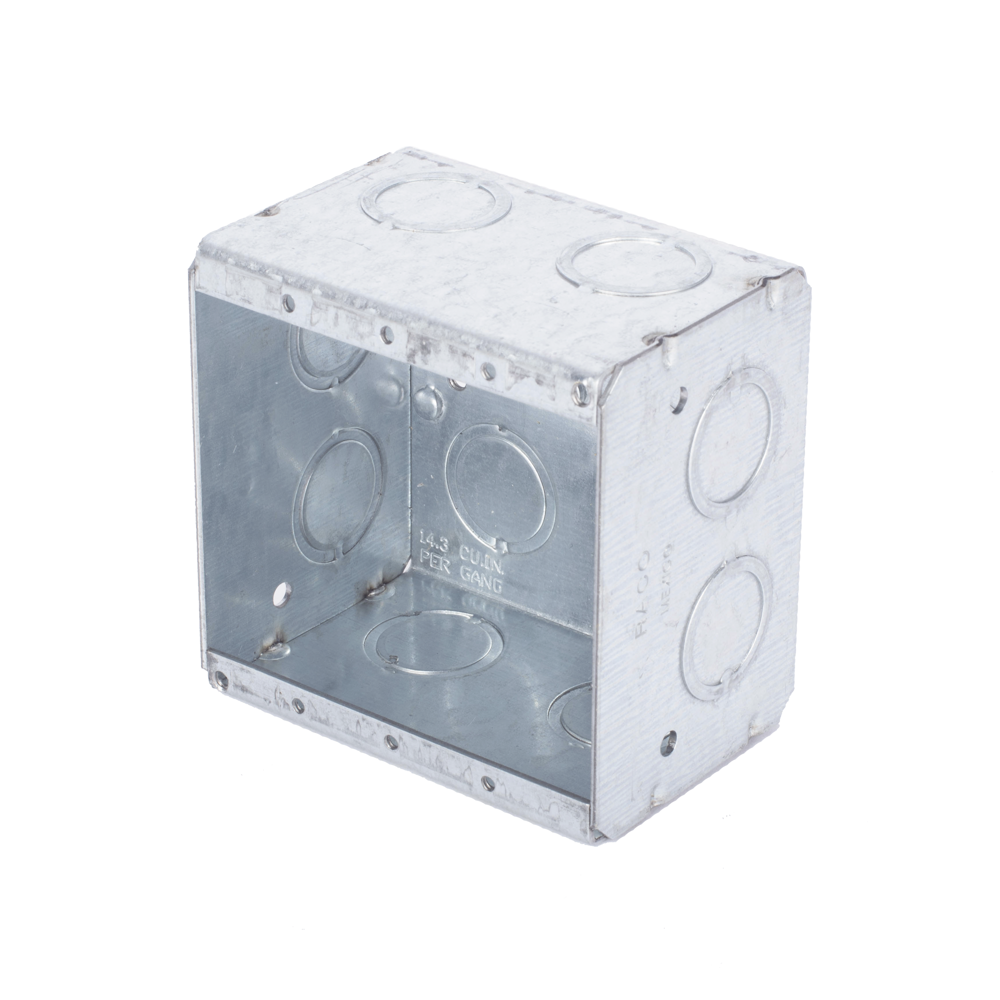 Caja Cuadrada Galvanizada de 4" x 4", profundidad de 2 1/8". Cuenta con 10 KO de 1/2" y 6 TKO (1/2" - 3/4"))