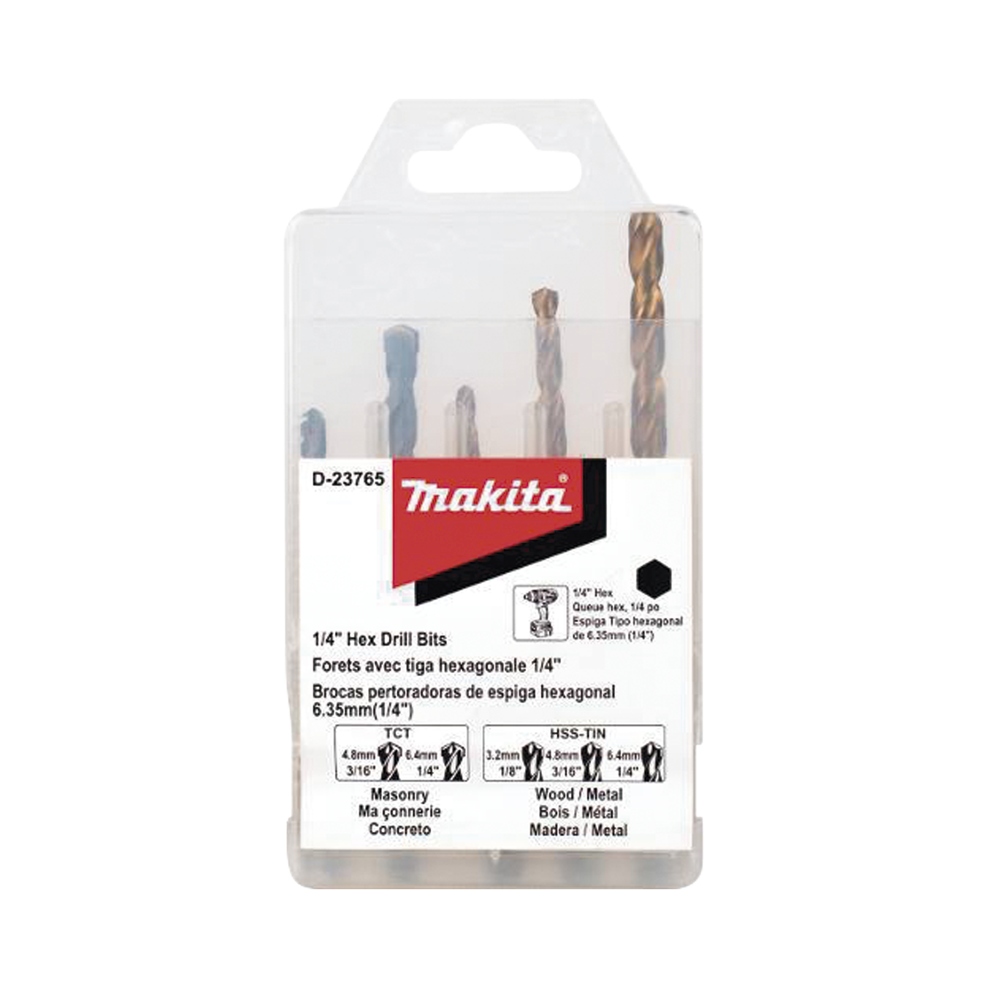 Juego de 5 Brocas con Inserción Hexagonal de 1/4". De concreto: 3/16" y 1/4". Para metal: 1/8", 3/16" y 1/4".