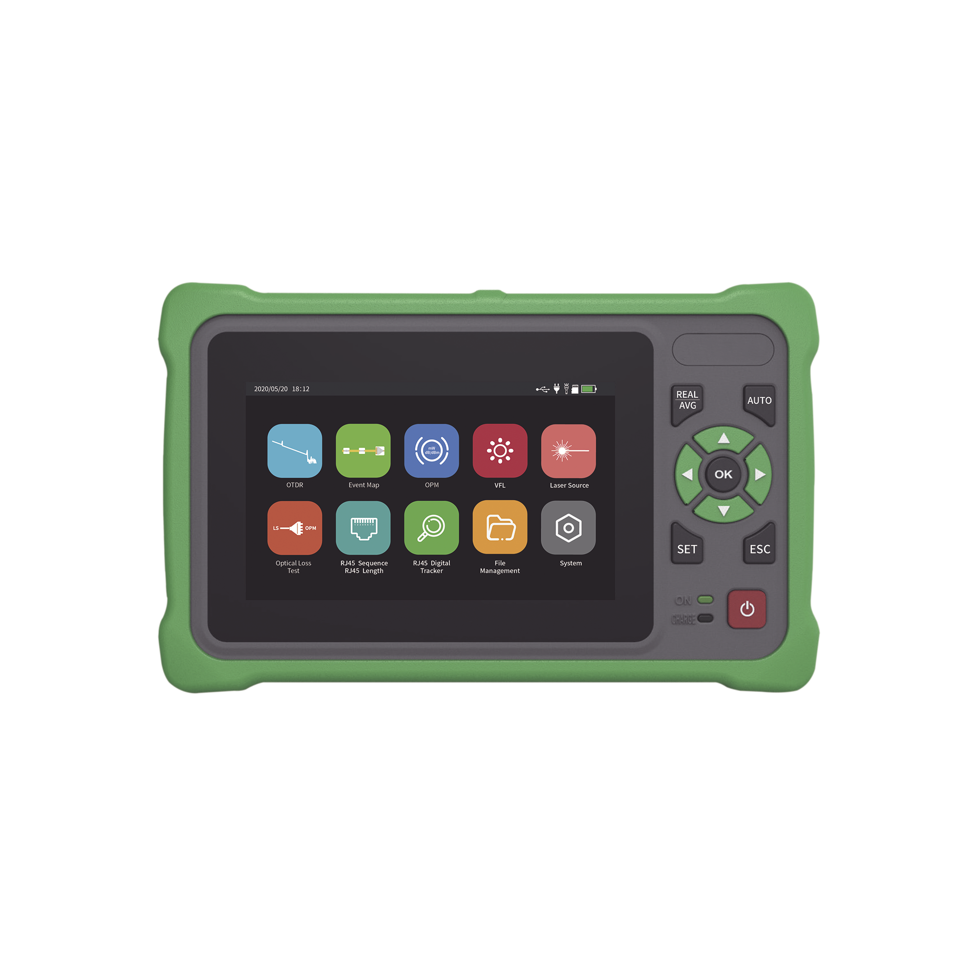 OTDR Touch para Pruebas en los Enlaces de Fibra Óptica / Longitudes de onda 1310nm y 1550nm / Función VFL 10mW / Función OPM / Función de Mapeo de cables de Red RJ45 / Recargable / Distancia de prueba de hasta 260km
