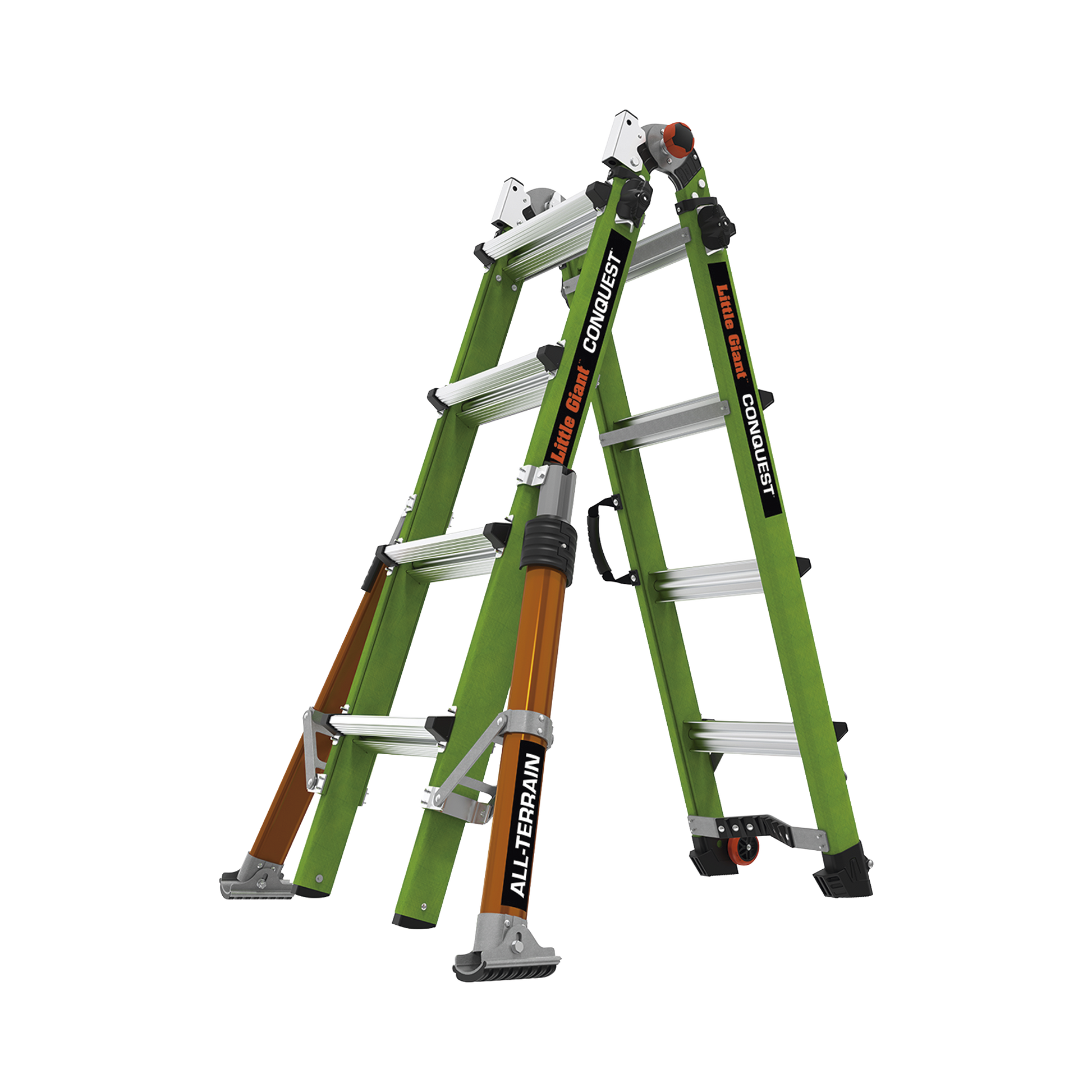 Más ligera, pero más fuerte que la fibra de vidrio promedio, la escalera Conquest 2.0 y Conquest All-Terrain están fabricados con fibra de vidrio no conductora Hi-Viz Green de Little Giant.