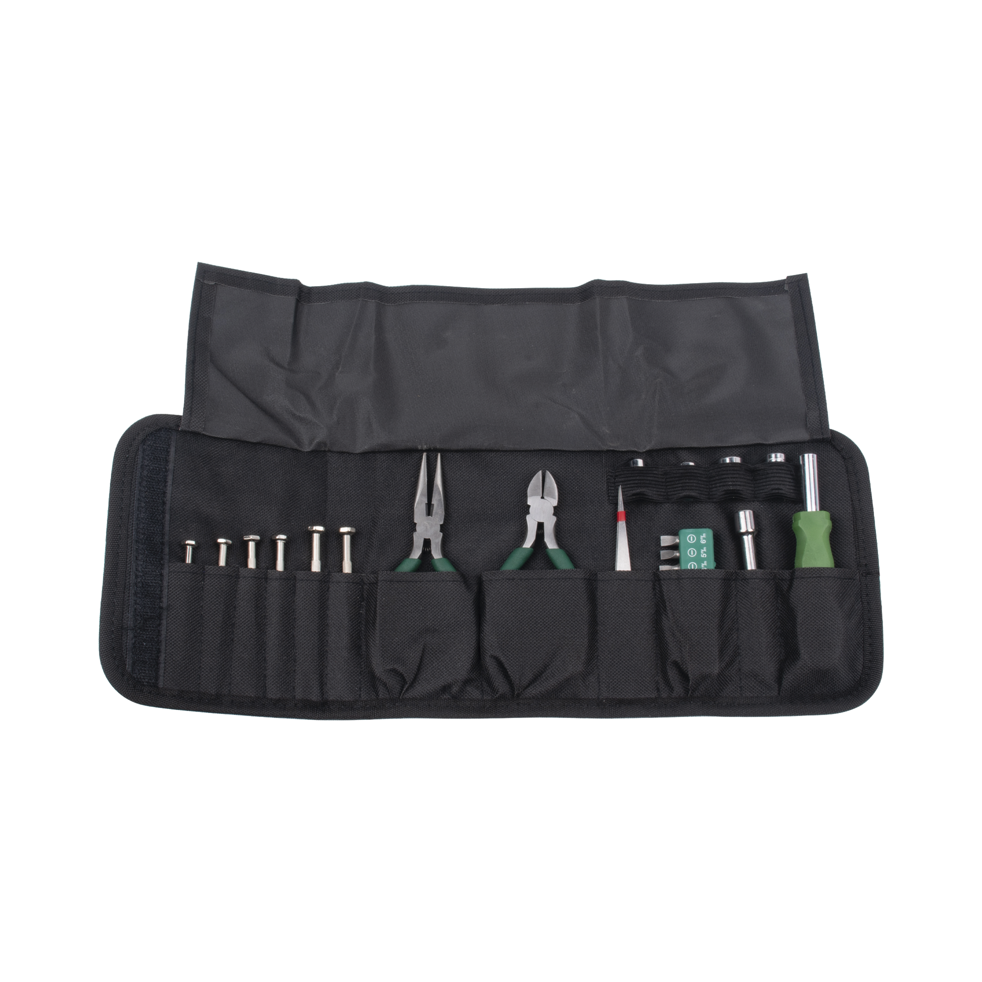 Juego de herramientas portátiles con práctico estuche tipo cartera.