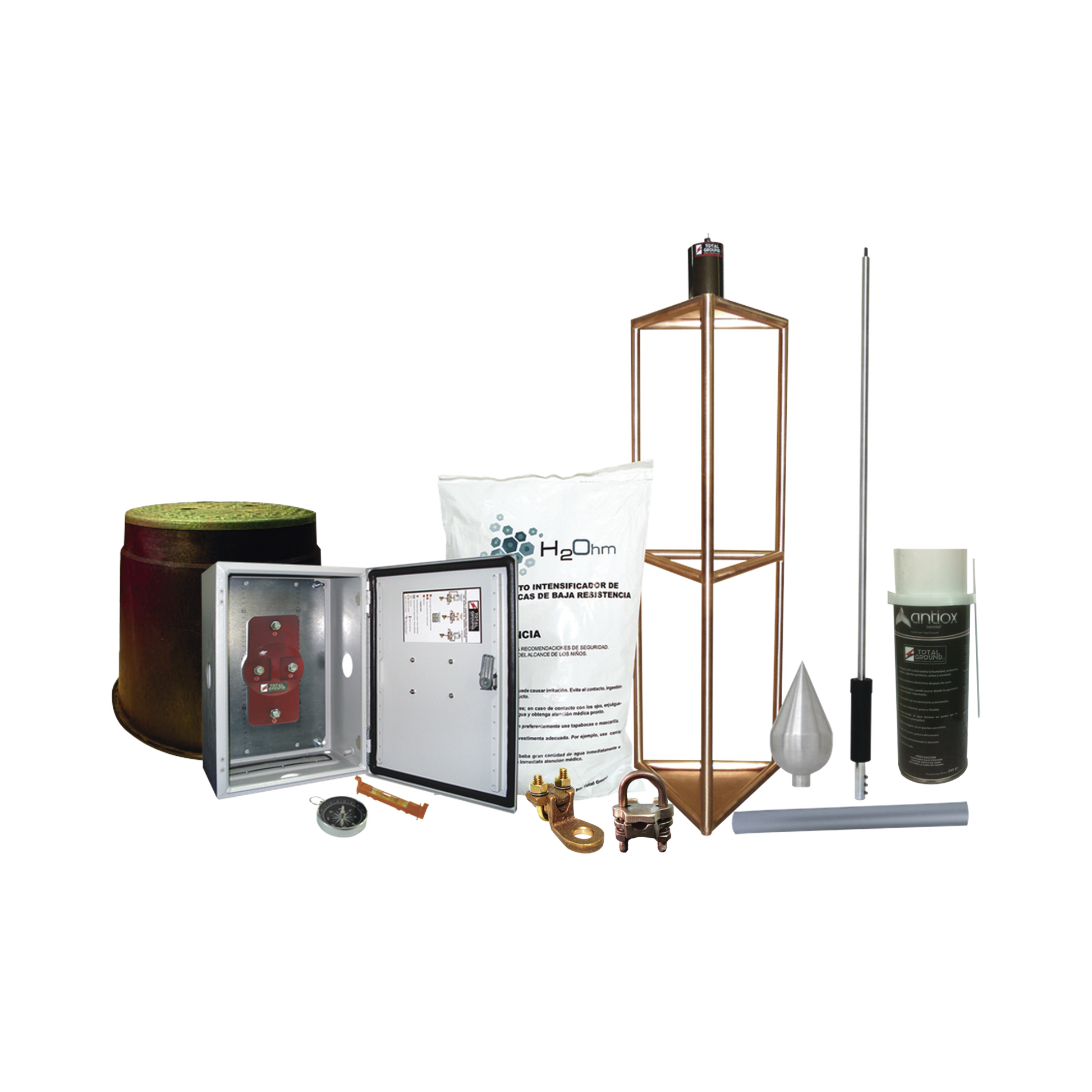 Punta pararayos con mástil de 1.2mElectrodo de 1000 A (TG1000). 8 Sacos de 11 Kg de mejorador de suelo (H2OHM).