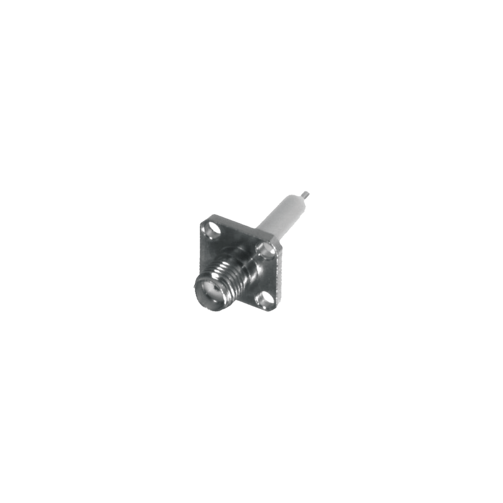 Conector SMA Hembra, Montaje de Panel Cuadrado, 4 Perforaciones, Soldable con Dieléctrico Extendido, Níquel/ Oro/ Teflón.